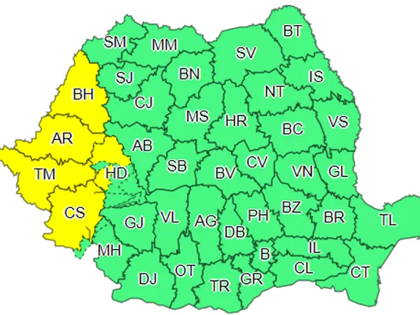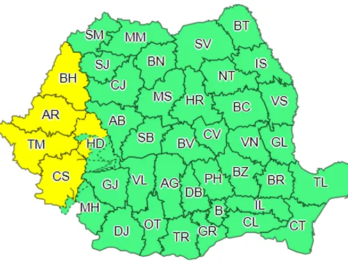 În perioada 5 august, ora 15.00 - 6 august, ora 2.00, în Banat, Crişana şi local în zona Carpaţilor Occidentali, vor fi perioade cu instabilitate atmosferică, ce se va manifesta prin averse ce vor avea şi caracter torenţial, descărcări electrice, intensificări de scurtă durată ale vântului şi vijelii.