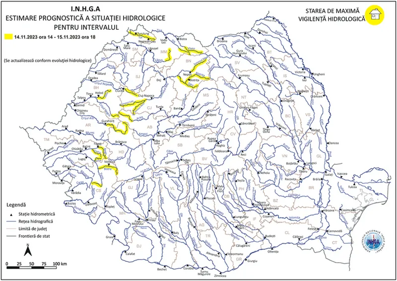 Hidrologii au emis o atenționare de Cod galben de viituri pe râuri din 10 judeţe din nordul și nord-vestul României. Aceasta este valabilă până miercuri, 15 noiembrie, seara.