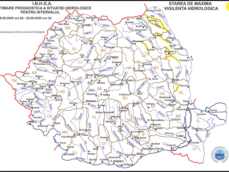 Conform prognozei de specialitate, până la ora 00:00, vor fi viituri rapide, creşteri de debite şi de niveluri, cu posibile depăşiri ale Cotelor de atenţie, pe râurile: Prut - afluenţii aferenţi sectorului aval confluenţă cu râul Jijia (judeţele Iaşi, Vaslui şi Galaţi). De asemenea, fenomenele hidrologice periculoase se pot produce cu probabilitate şi intensitate mai mare pe unele râuri mici din bazinul hidrografic Elan.