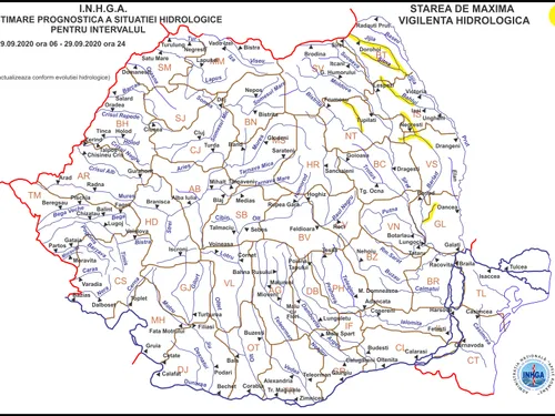 Institutul Naţional de Hidrologie şi Gospodărire a Apelor (INHGA) a emis avertizări Cod galben de inundaţii, valabile pe râuri din şapte judeţe.