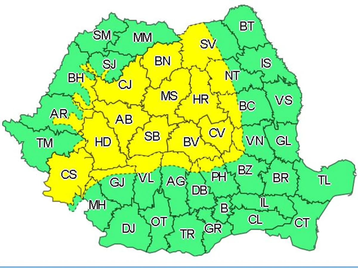 Judeţele vizate de noua avertizare Cod galben sunt Suceava, Neamţ, Bacău, Vrancea, Buzău, Prahova, Dâmboviţa, Argeş, Vâlcea, Gorj, Mehedinţi, Caraş-Severin, Hunedoara, Alba, Sibiu, Braşov, Covasna, Harghita, Mureş, Bistriţa-Năsăud, Cluj, Sălaj, Bihor şi Arad.