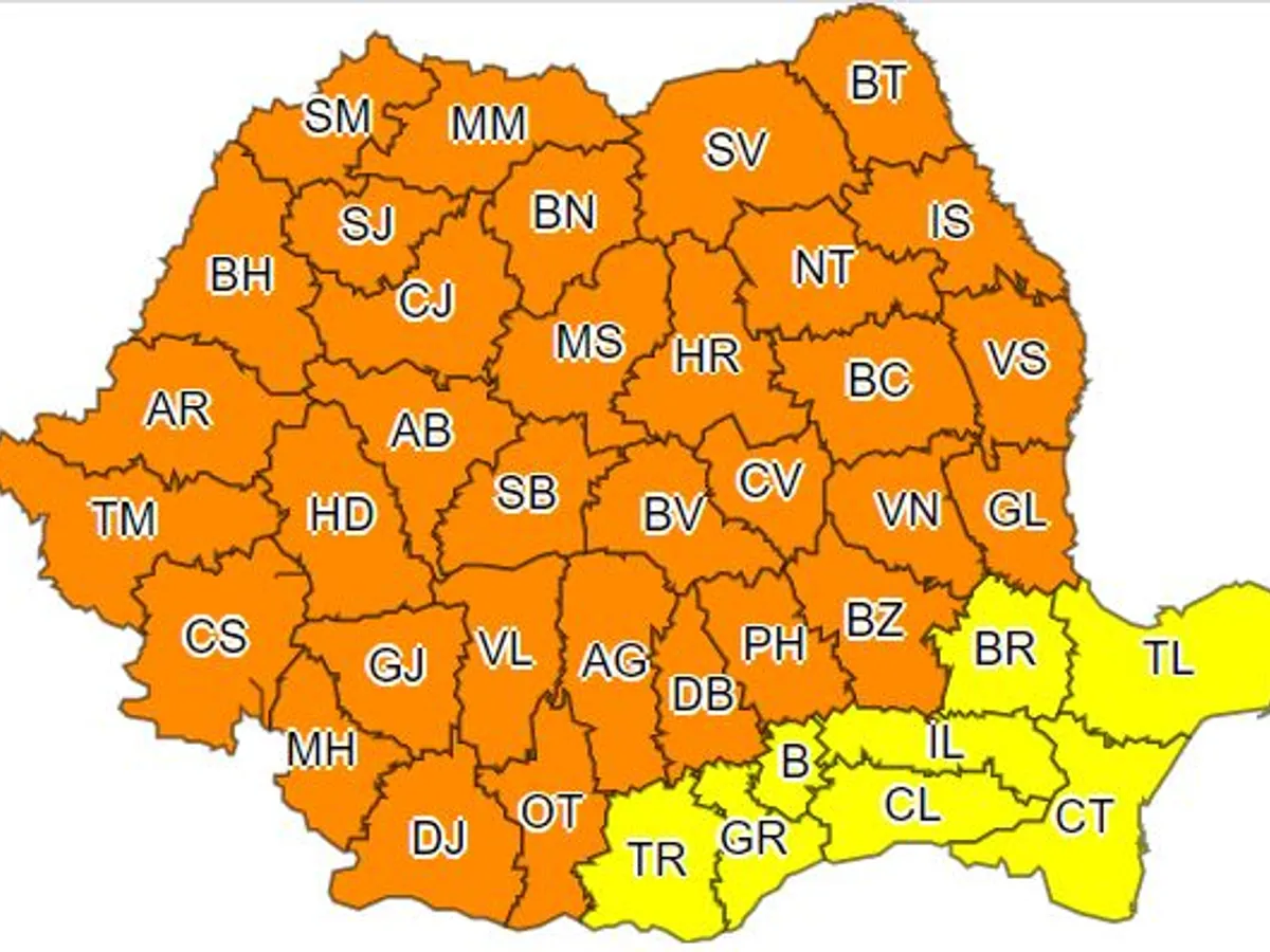În intervalul orar 12:00 - 23:00, este în vigoare avertizarea Cod portocaliu, iar prognoza de specialitate arată că, în cursul după-amiezii şi la începutul nopţii de marţi spre miercuri (16/17 iunie), în Oltenia, Banat, Crişana, Maramureş, Transilvania, Moldova şi local în Muntenia vor fi perioade cu averse torenţiale şi se vor acumula cantităţi de apă de peste 40 l/mp şi pe arii restrânse 50 - 80 l/mp.