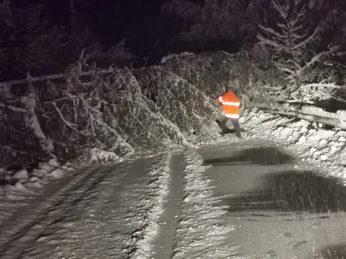 În Suceava au avut loc deja primele incidente provocate de stratul mare de zăpadă: mai mulți arbori au căzut pe carosabil.