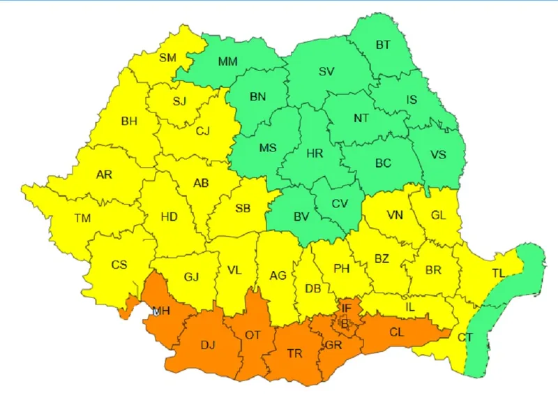 Meteorologii au emis o avertizare cod portocaliu de caniculă valabilă în intervalul 24 iulie, ora 10 – 25 iulie, ora 10, pentru sudul şi vestul Olteniei, precum şi pentru sudul şi centrul Munteniei, unde valul de căldură va persista, va fi caniculă, disconfort termic accentuat, iar indicele temperatură-umezeală (ITU) va depăşi pragul critic de 80 de unităţi.