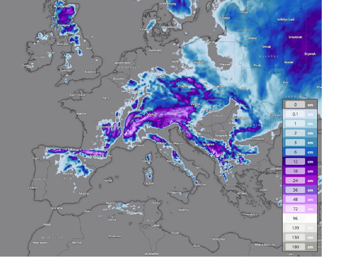 Mai jos sunt prezentate cantitățile totale de zăpadă pentru 5 zile în Europa continentală. Sunt prognozate ninsori proaspete în multe zone, inclusiv în nordul Regatului Unit, nordul Iberiei, regiunea alpină, vestul Balcanilor și Europa Centrală. De asemenea, sunt prevăzute ninsori mai abundente în Europa de Est și Scandinavia.