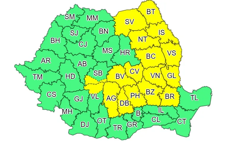 17 județe se află sub cod galben de ploi, avertizează Administrația Națională de Meteorologie (ANM).
