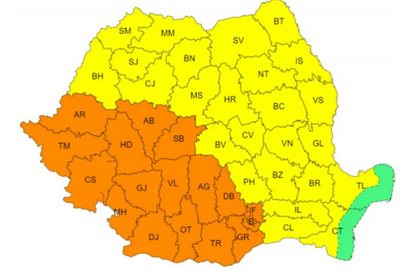 Administraţia Naţională de Meteorologie (ANM) a emis o atenţionare Cod Galben privind temperaturi ridicate, caniculă, disconfort termic ridicat, valabilă marţi, în judeţele Arad, Timiş, Caraş-Severin, Hunedoara, Alba, Sibiu, Vâlcea, Gorj, Mehedinţi, Dolj, Olt, Argeş, Dâmboviţa, Prahova, Ialomiţa, Călăraşi, Ilfov, Giurgiu, Teleorman şi municipiul Bucureşti.