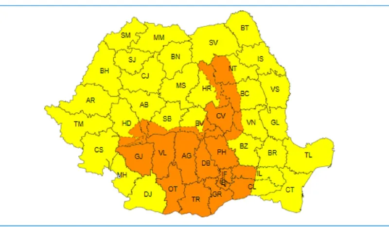 În intervalul 29 septembrie, ora 10.00 – 30 septembrie, ora 12.00, este cod portocaliu de ploi în nordul şi estul Olteniei, în cea mai mare parte a Munteniei precum şi în Carpaţii Meridionali şi Orientali.