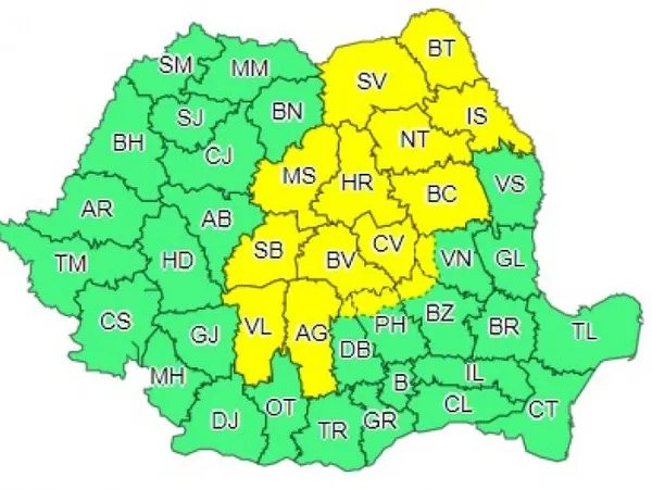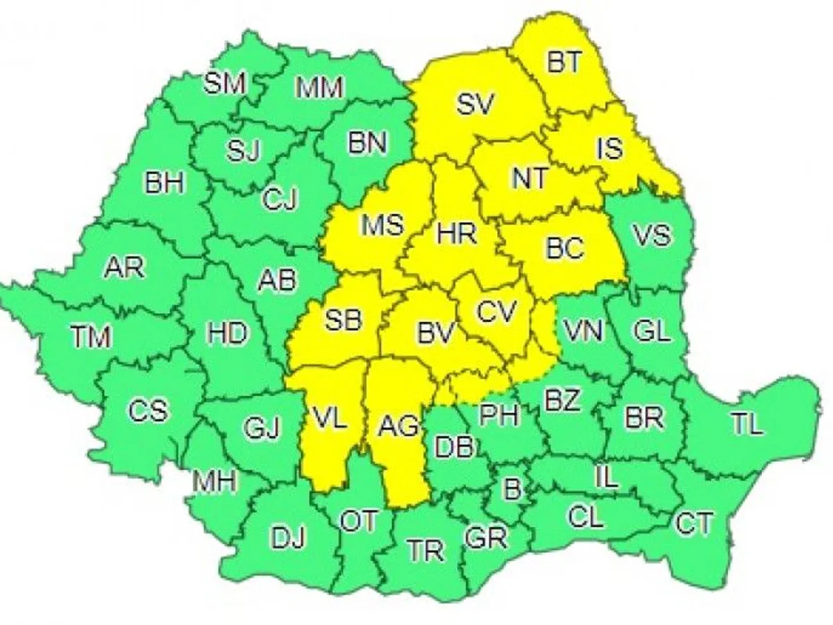 Joi între orele 12:00 - 21:00, în județele Suceava, Botoșani, Neamț, Iași, Bacău, Harghita, Mureș, Sibiu, Brașov, Covasna, Vrancea, Buzău, Prahova, Dâmbovița, Argeș și Vâlcea vor fi perioade cu instabilitate atmosferică accentuată ce se va manifesta prin averse, descărcări electrice, intensificări ale vântului, vijelii și grindină.