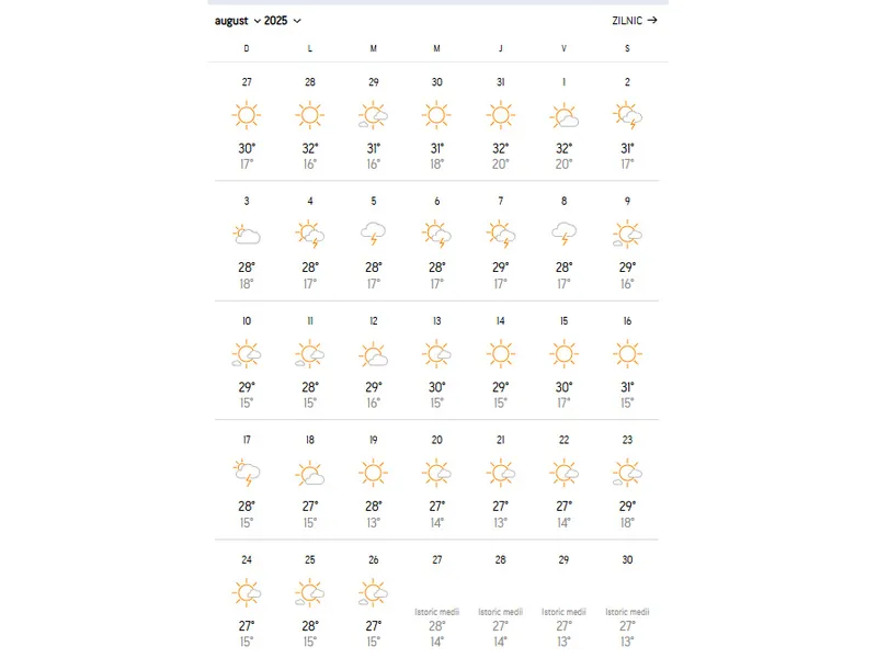 Luna august va începe cu vreme caldă în Capitală, cu două zile cu peste 30 de grade Celsius, însă pentru restul lunii, valorile termice se vor menține în jurul unei medii de 28 de grade Celsius.