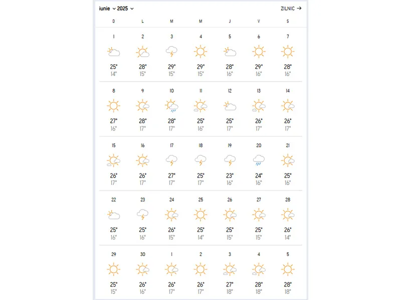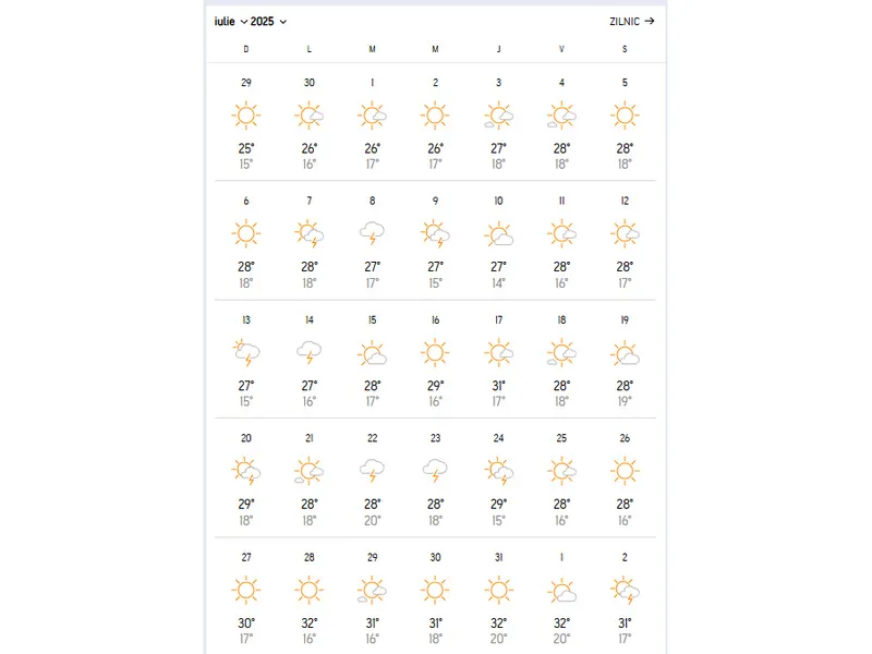 Începutul lunii august va debuta cu două zile călduroase în Iași, cu temperaturi ce pot depăși 30 de grade. Apoi, media temperaturilor va fi în jur de 28 de grade Celsius.