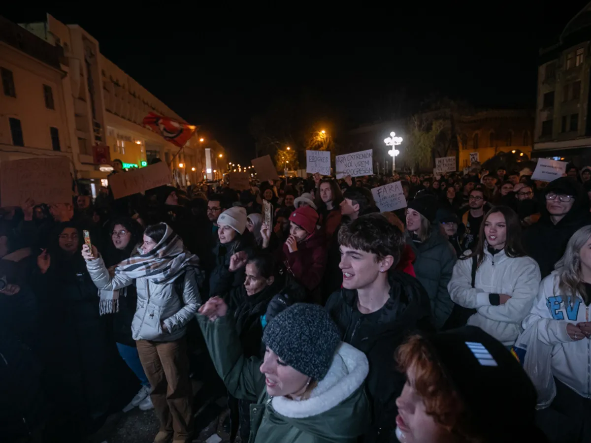 „Azi în Timişoara, mâine în toată ţara!", au strigat tinerii, nemulțumiți de votul în masă primit de candidatul pro-rus Călin Georgescu, un personaj extrem de controversat care vine din "sistemul" pe care acum cu ipocrizie îl blamează în încercarea lui a manipula masele de votanți care au tendința să creadă în teoriile conspirației și în promisiunile extremiștilor.
