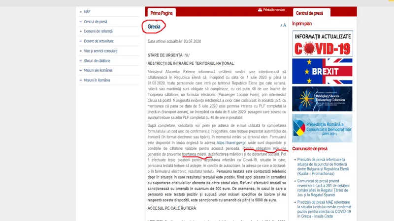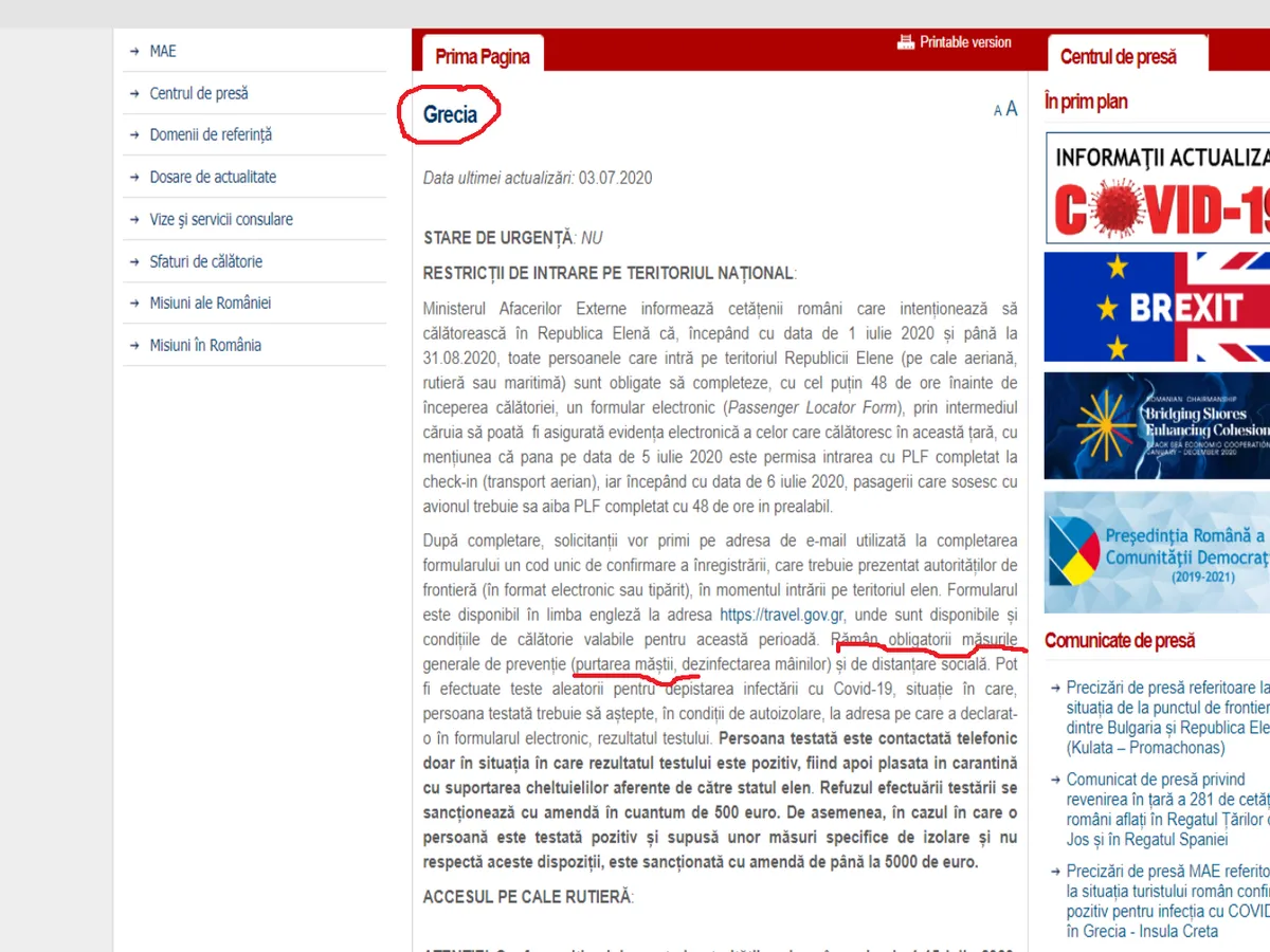 Grecia, însă, nu stă la discuții și nici nu roagă (așa cum pretinde Cataramă) cetățenii sau turiștii să poarte mască. Ministerul Afacerilor de Externe publică pe pagina sa www.mae.ro restricțiile și măsurile obligatorii impuse de fiecare țară pentru cetățeni. Astfel, în Grecia purtarea măștii este obligatorie după cum puteți vedea din facsimil și nu la latitudinea turiștilor străini precum Cataramă.