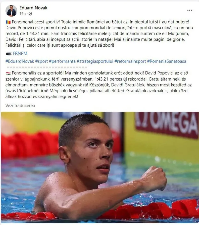 Ministrul Eduard Novak a scos expresia „toate inimile României” din mesajul în maghiară în care-l felicita pe înotătorul David Popovici pentru câștigarea titlului mondial la înot în proba de 200 metri liber.