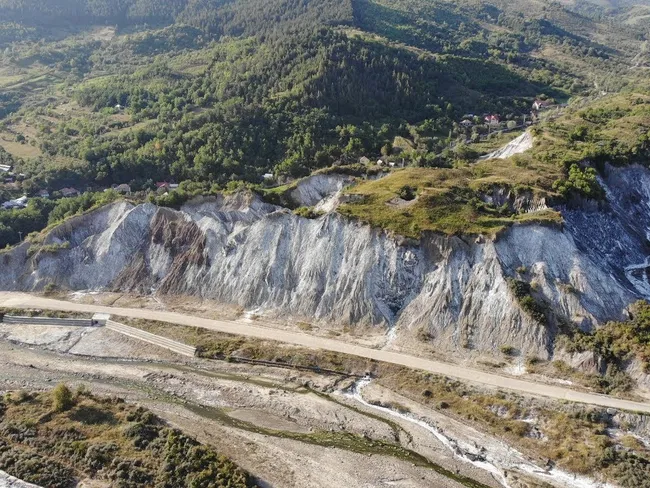 Intrarea în grotă a fost blocată cu câţiva ani în urmă de o alunecare de teren, care a format în munte un crater cu pereţi albi, adânc de peste o sută de metri.