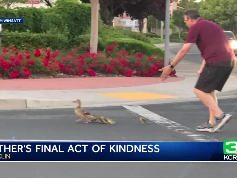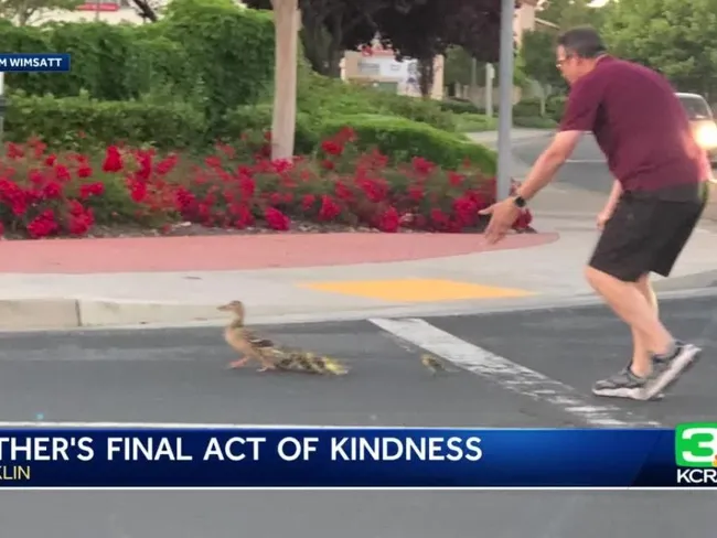 Un bărbat din California, care a murit după ce a fost lovit de o mașină, a fost văzut ajutând o familie de rațe să traverseze strada cu câteva momente înainte de coliziune, a declarat poliția locală.