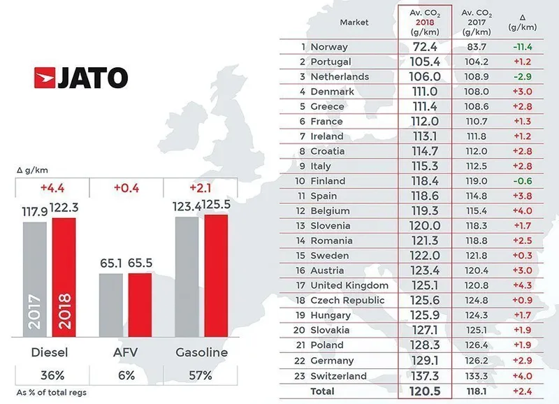 Media totală a emisiilor de CO2 a crescut cu 2,4 g/km în 2018, fiind cea mai mare valoare din ultimii patru ani. Analiza efectuată de JATO Dynamics a acoperit 23 de piețe din Europa, printre care și România.