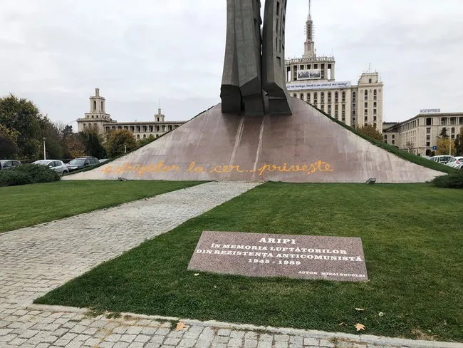 Pe monumentul „Aripi” din Piața Presei Libere, dedicat celor care s-au jertfit împotriva comunismului, o persoană necunoscută a scris cu vopsea „e strigător la cer... privește”.