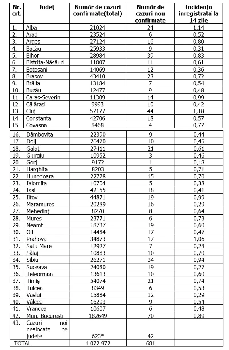 În total, în România au fost confirmate 1.072.972 de cazuri de infectare cu coronavirus, iar 29.662 de oameni infectați au murit.