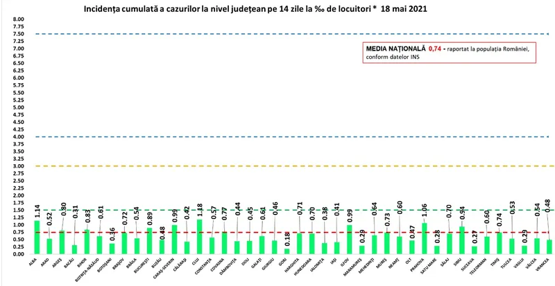Coeficientul infectărilor cumulate la 14 zile, raportate la 1.000 de locuitori este calculat de către Direcțiile de Sănătate Publică, la nivelul Municipiului București și al județelor. Mai jos aveți graficul realizat în baza raportărilor primite de CNCCI de la Direcțiile de Sănătate Publică: