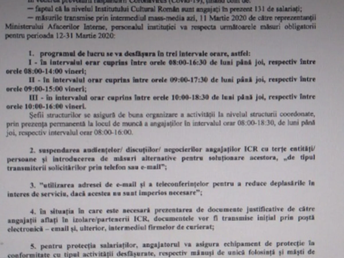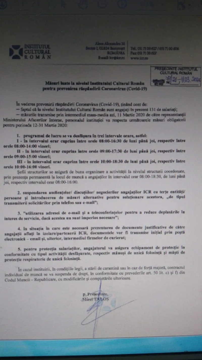 "Referitor la solicitarea dumneavoastră, înregistrată la Institutul Cultural Român cu nr. 65/33/5.03.2020, vă aducem la cunoștință faptul că, urmare a Decretului prezidențial din data de 16 martie 2020, privind instituirea stării de urgență pe teritoriul României vă rugăm să aveți în vedere articolul 56 care menționează următoarele: