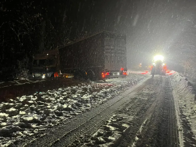 În judeţul Timiş, traficul este oprit pe DN 68A, în afara localităţii Coşava, din cauza unui TIR rămas înzăpezit, care îngreunează intervenţia utilajelor de deszăpezire.