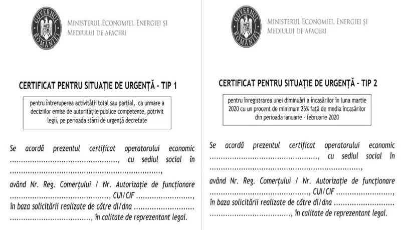 Societăţile care au deschis activitatea în perioada decembrie 2019 - februarie 2020 şi nu pot justifica o scădere de 25% a veniturilor pot opta pentru Certificat de Situaţie de Urgenţă de tip TIP 1 (ALBASTRU) - destinat solicitanţilor care cer acordarea pentru că au întreruperea totală sau parţială a activităţii ca urmare a efectelor deciziilor emise de autorităţile publice competente, potrivit legii, în perioada stării de urgenţă.