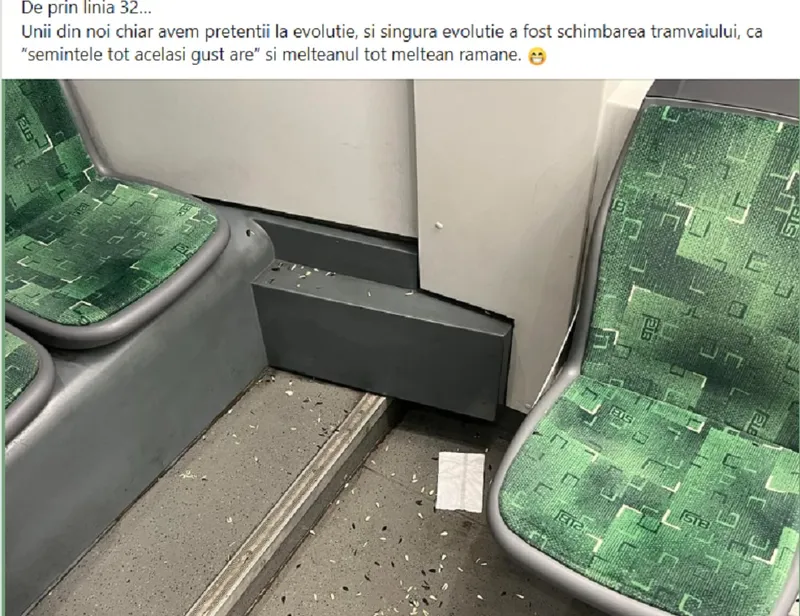 Un bucureștean a postat pe un grup de socializare o imagine dintr-un tramvai al liniei 32 din Capitală. Pe jos și pe scaune este plin de coji de semințe.