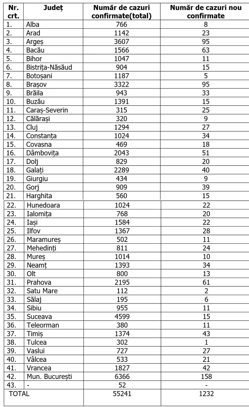 În urma testelor efectuate la nivel național, față de ultima raportare, au fost înregistrate 1.232 de cazuri noi de persoane infectate cu SARS – CoV - 2 (COVID – 19), acestea fiind cazuri care nu au mai avut anterior un test pozitiv.