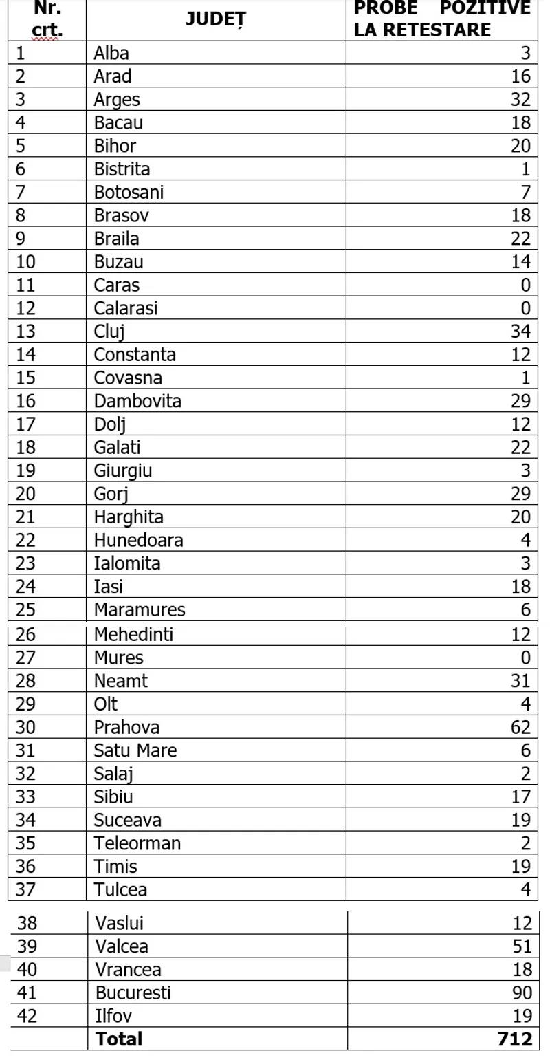 Distinct de cazurile nou confirmate, în urma retestării pacienților care erau deja pozitivi, 712 de persoane au fost reconfirmate pozitiv.
