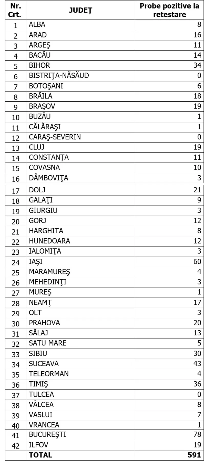 Distinct de cazurile nou confirmate, în urma retestării pacienților care erau deja pozitivi, 591 persoane au fost reconfirmate pozitiv.