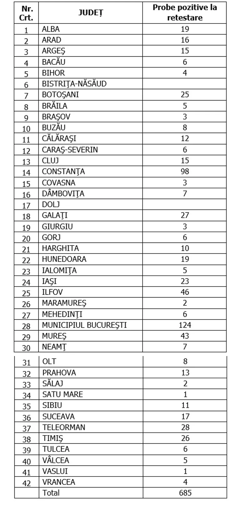 Distinct de cazurile nou confirmate, în urma retestării pacienților care erau deja pozitivi, 685 de persoane au fost reconfirmate pozitiv.