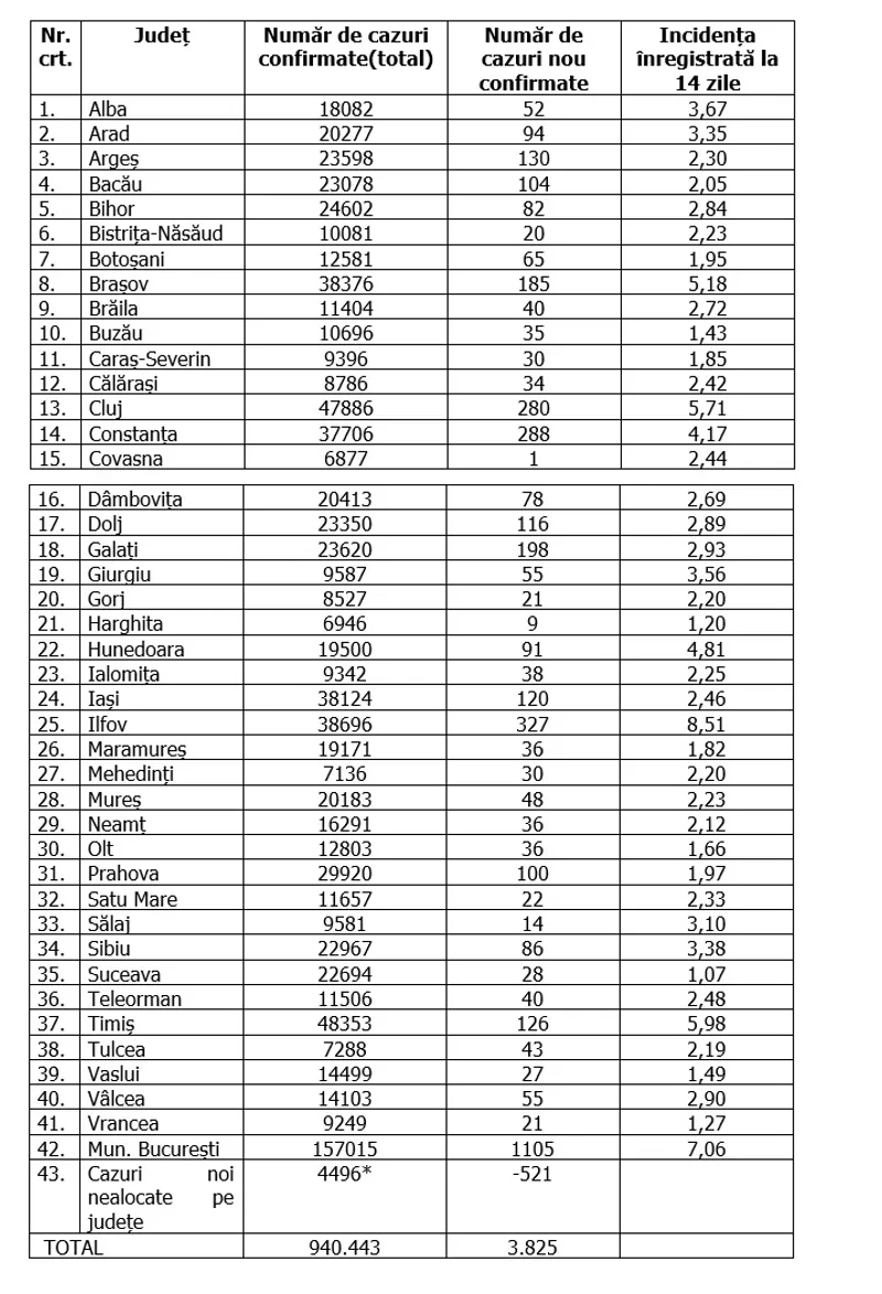 În total, în România au fost confirmate 940.443 de cazuri de infectare cu coronavirus, iar 23.234 de oameni infectați au murit.