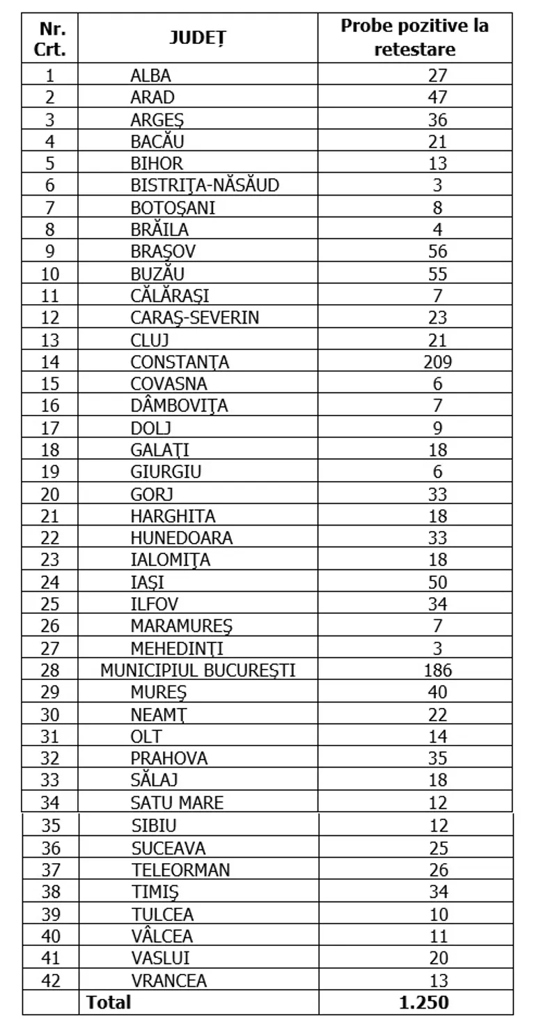 Distinct de cazurile nou confirmate, în urma retestării pacienților care erau deja pozitivi, 1.250 de persoane au fost reconfirmate pozitiv. Distribuția pe județe a acestor cazuri o regăsiți în tabelul de mai jos: