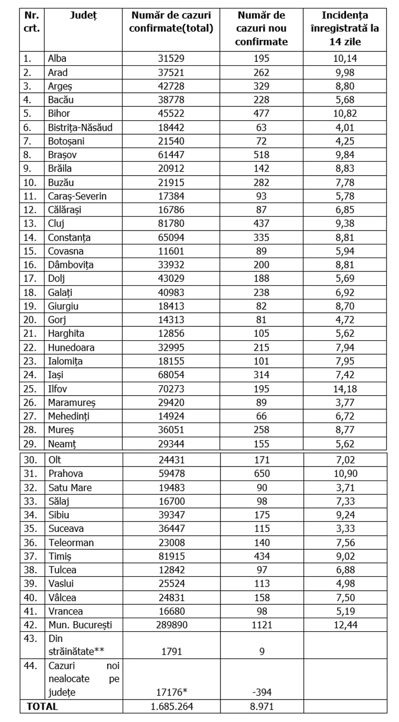 Distribuția pe județe a cazurilor per total și a celor noi o regăsiți în tabelul de mai jos: