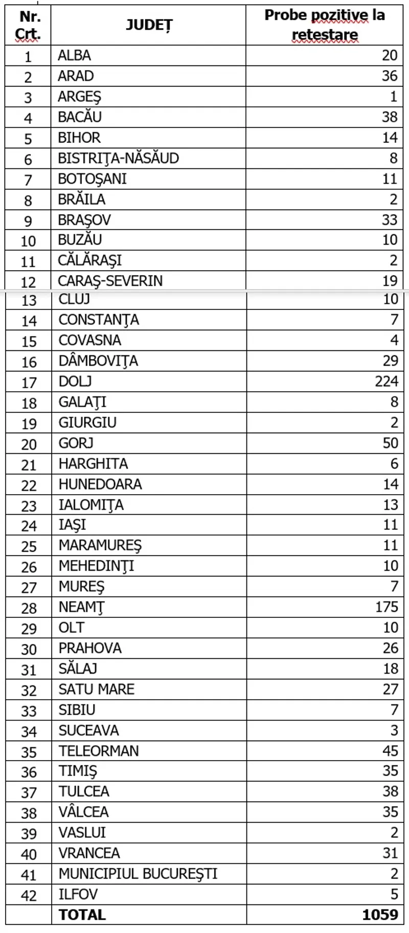 Distinct de cazurile nou confirmate, în urma retestării pacienților care erau deja pozitivi, 1.059 de persoane au fost reconfirmate pozitiv.