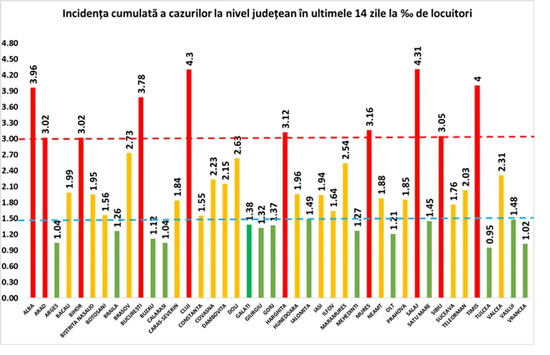 Coeficientul infectărilor cumulate la 14 zile, raportate la 1.000 de locuitori este calculat de către Direcțiile de Sănătate Publică, la nivelul Municipiului București și al județelor. Mai jos aveți graficul realizat în baza raportărilor primite de CNCCI de la Direcțiile de Sănătate Publică: