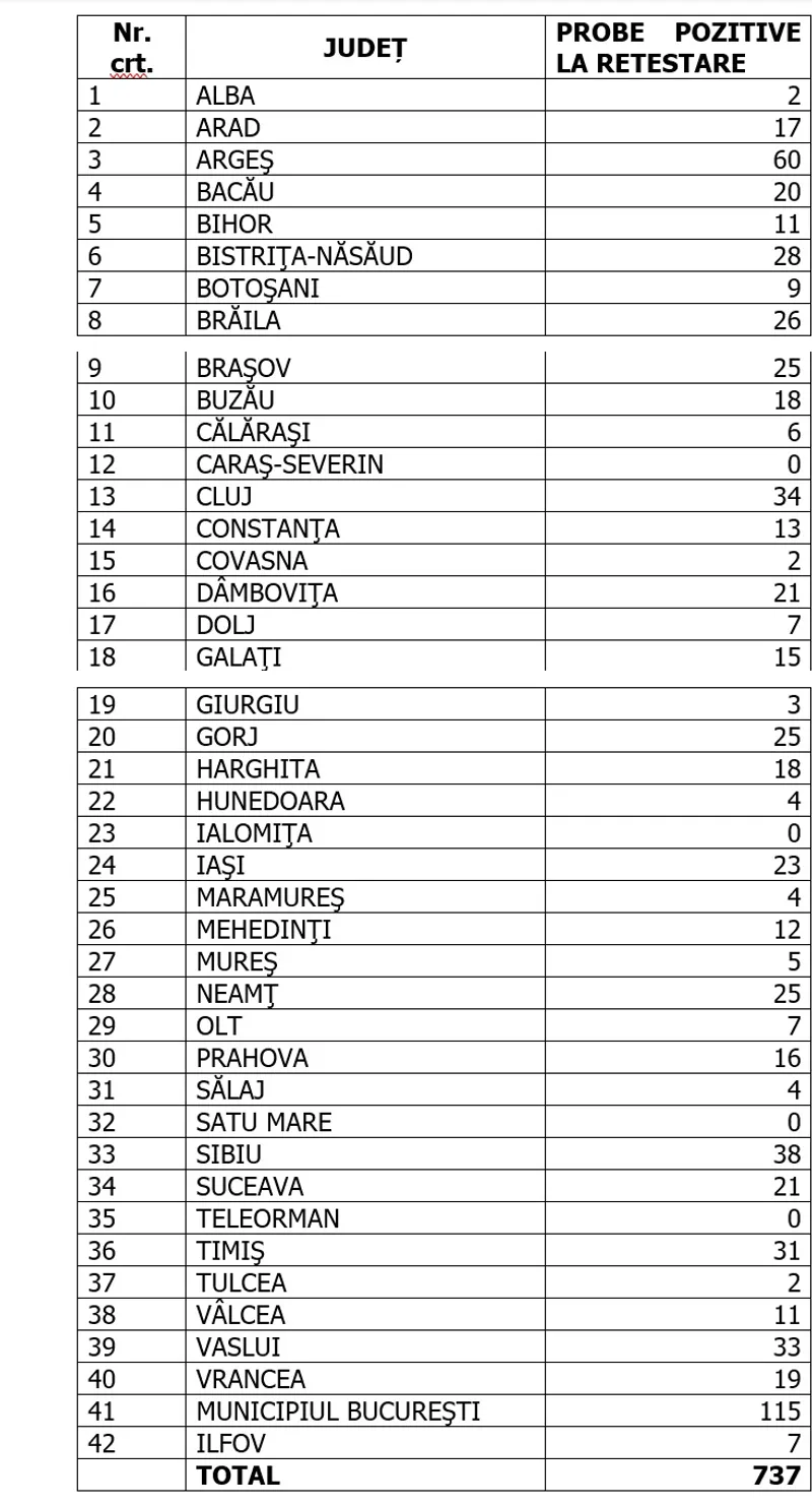 Distinct de cazurile nou confirmate, în urma retestării pacienților care erau deja pozitivi, 737 de persoane au fost reconfirmate pozitiv.