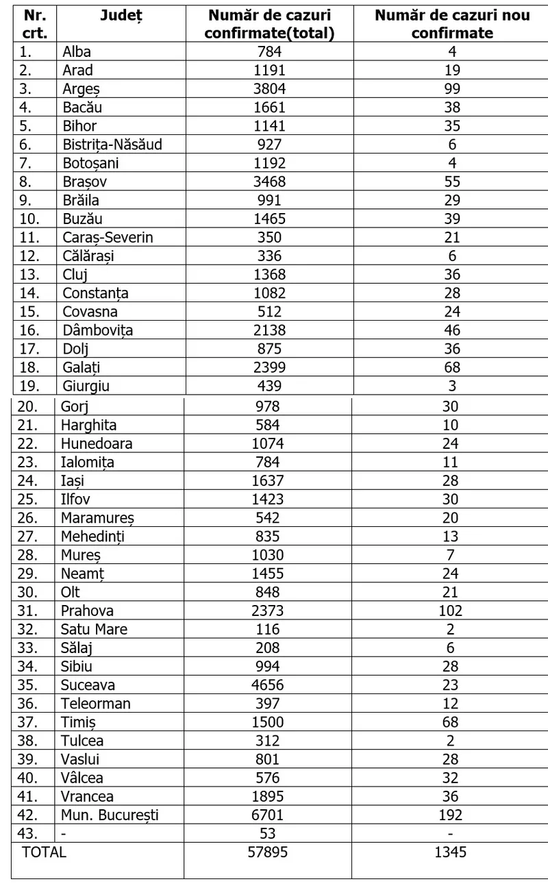 Din cei aproape 58.000 de pacienți confirmați cu COVID, 28.992 de pacienți au fost declarați vindecați, iar 5.639 de pacienți asimptomatici au fost externați la 10 zile după depistare.