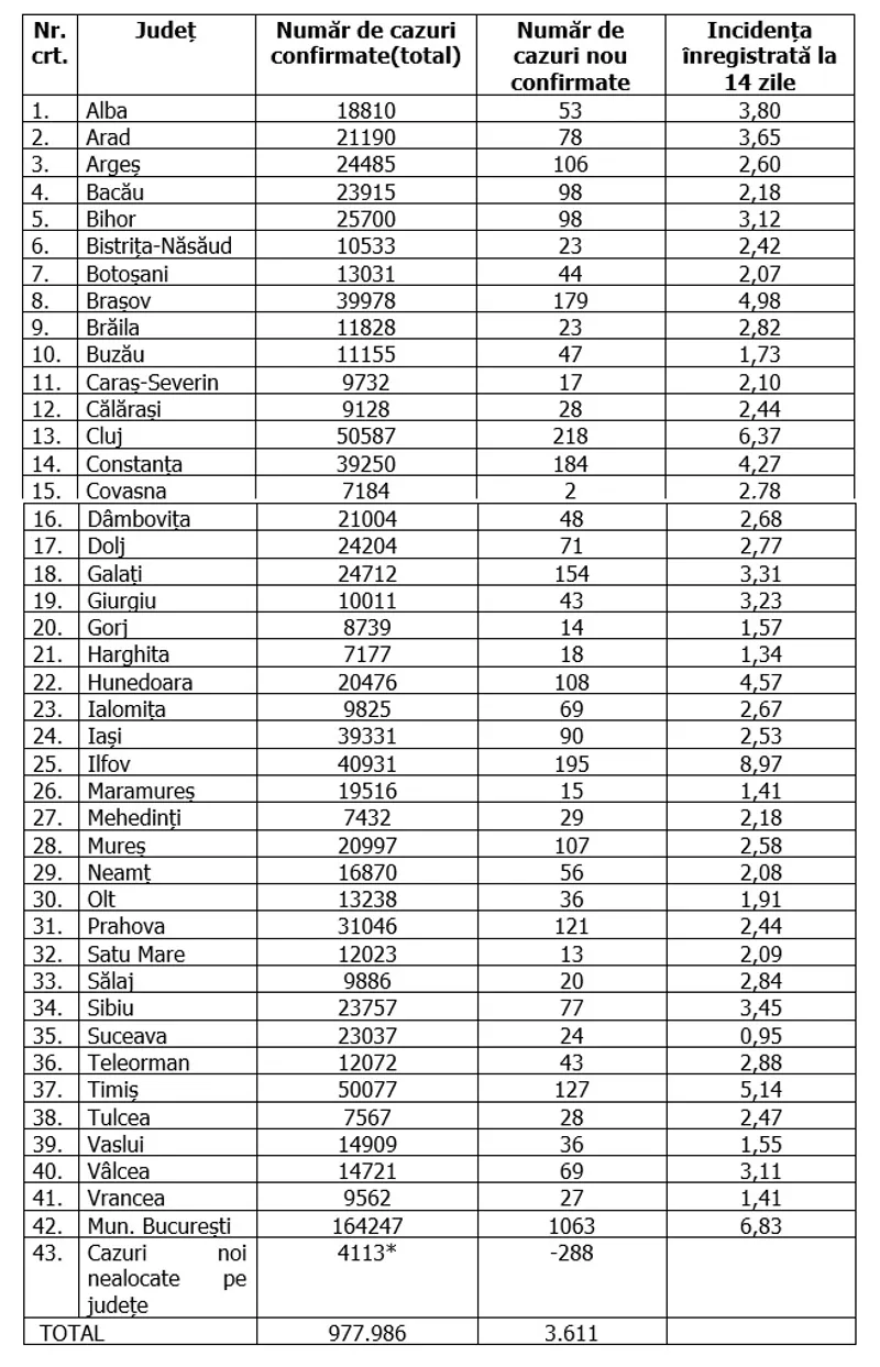 În total, în România au fost confirmate 977.986 de cazuri de infectare cu coronavirus, iar 24.190 de oameni infectați au murit.