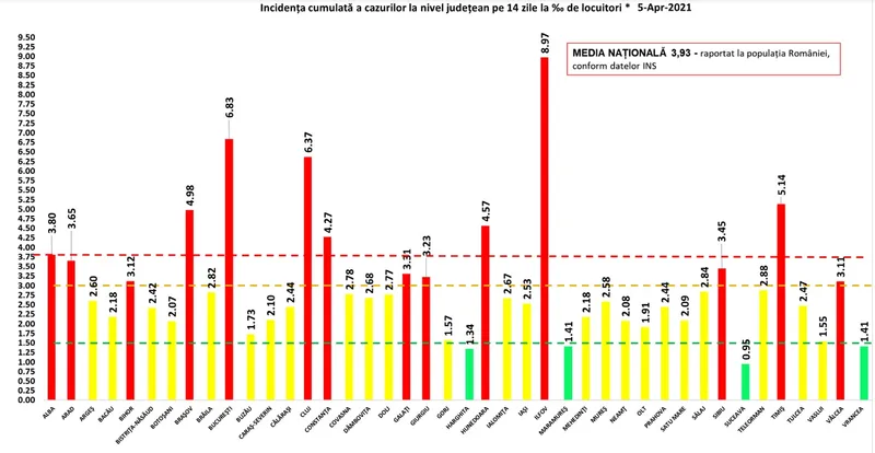 Coeficientul infectărilor cumulate la 14 zile, raportate la 1.000 de locuitori este calculat de către Direcțiile de Sănătate Publică, la nivelul Municipiului București și al județelor. Mai jos aveți graficul realizat în baza raportărilor primite de CNCCI de la Direcțiile de Sănătate Publică: