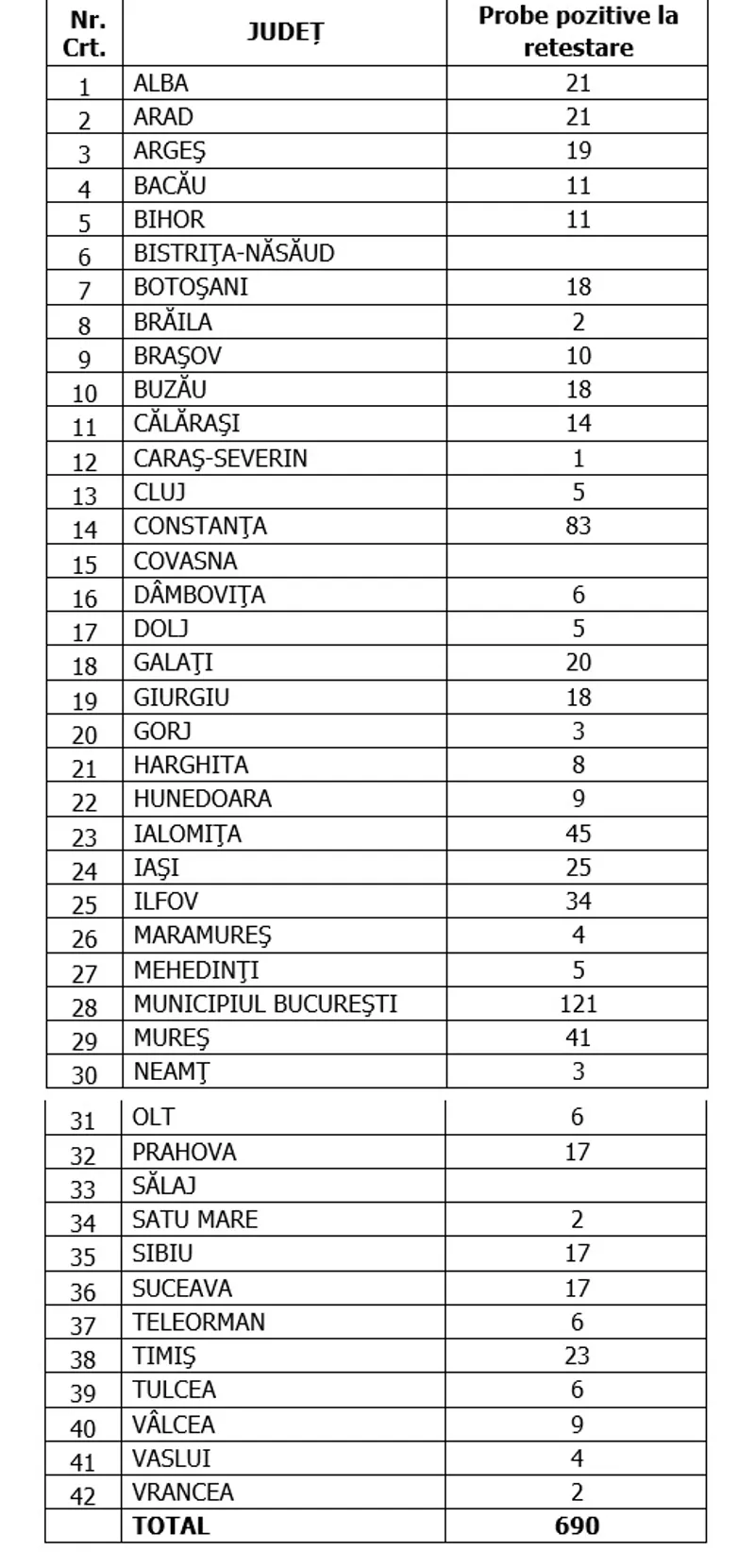 Distinct de cazurile nou confirmate, în urma retestării pacienților care erau deja pozitivi, 690 de persoane au fost reconfirmate pozitiv.