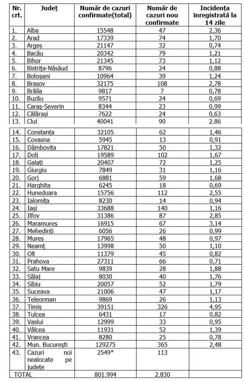 În total, în România au fost confirmate 801.994 de cazuri de infectare cu coronavirus, iar 20.350 de persoane diagnosticate cu boala au murit.