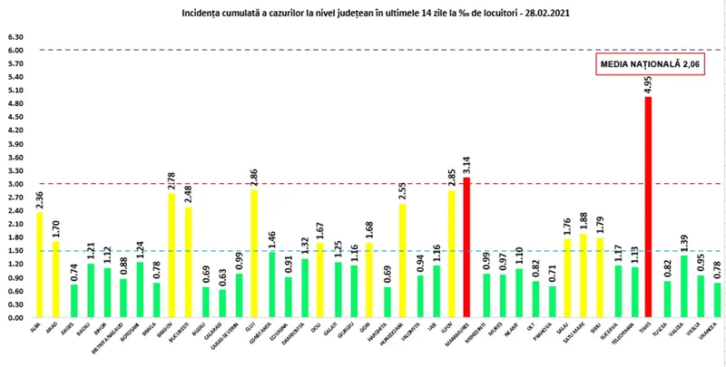 Coeficientul infectărilor cumulate la 14 zile, raportate la 1.000 de locuitori este calculat de către Direcțiile de Sănătate Publică, la nivelul Municipiului București și al județelor. Mai jos aveți graficul realizat în baza raportărilor primite de CNCCI de la Direcțiile de Sănătate Publică: