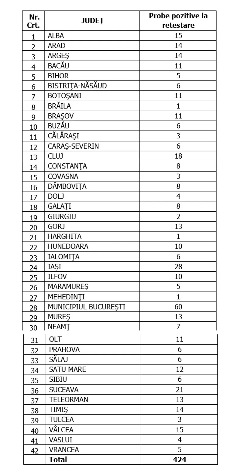 Distinct de cazurile nou confirmate, în urma retestării pacienților care erau deja pozitivi, 424 de persoane au fost reconfirmate pozitiv.