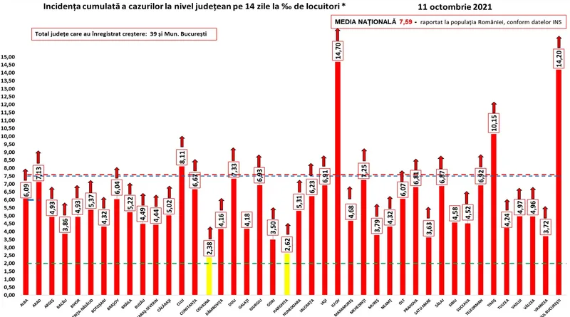 Coeficientul infectărilor cumulate la 14 zile, raportate la 1.000 de locuitori este calculat de către Direcțiile de Sănătate Publică, la nivelul Municipiului București și al județelor. Mai jos aveți graficul realizat în baza raportărilor primite de CNCCI de la Direcțiile de Sănătate Publică: