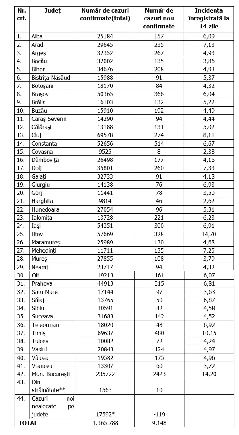 Distribuția pe județe a cazurilor per total și a celor noi o regăsiți în tabelul de mai jos: