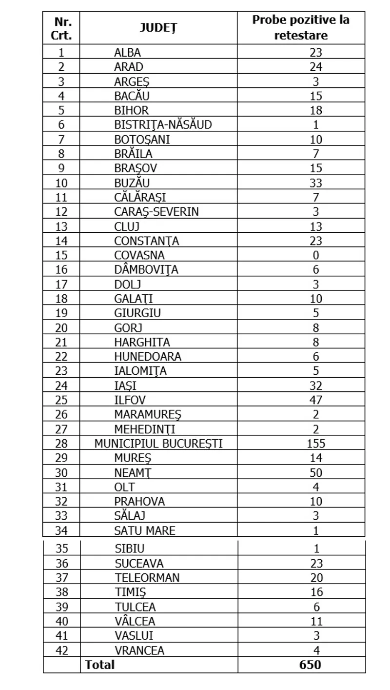 Distinct de cazurile nou confirmate, în urma retestării pacienților care erau deja pozitivi, 650 de persoane au fost reconfirmate pozitiv. Distribuția pe județe a acestor cazuri o regăsiți în tabelul de mai jos: