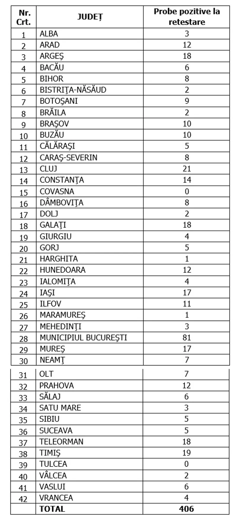 Distinct de cazurile nou confirmate, în urma retestării pacienților care erau deja pozitivi, 406 persoane au fost reconfirmate pozitiv.