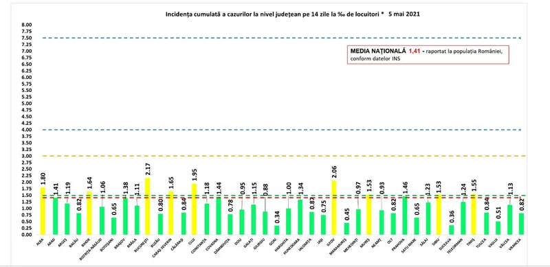 Coeficientul infectărilor cumulate la 14 zile, raportate la 1.000 de locuitori este calculat de către Direcțiile de Sănătate Publică, la nivelul Municipiului București și al județelor. Mai jos aveți graficul realizat în baza raportărilor primite de CNCCI de la Direcțiile de Sănătate Publică: